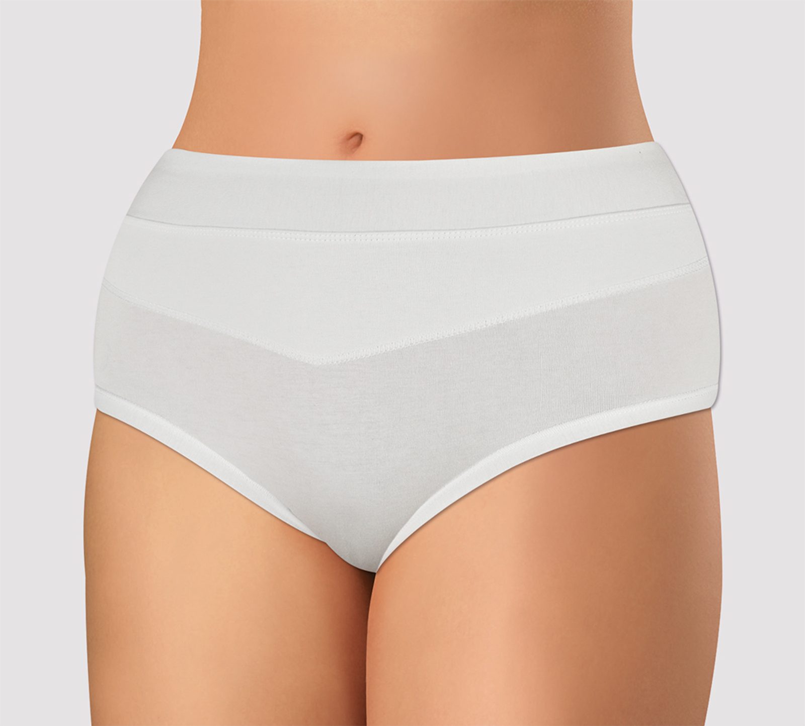 Dámské kalhotky vyššího střihu. Kalhotky jsou vyrobeny z velmi kvalitní elastické bavlny s příměsí vlákna Tactel, které dodává materiálu hebkost a prodyšnost. Materiál se skvěle přizpůsobí postavě a drží stálý tvar prádla. Díky širokému lemu v pase ideálně přiléhají k tělu a mají částečně stahovací efekt. Komfortní lem okolo nohou zaručuje, že se kalhotky nezařezávají do stehen. Bavlněný klínek.